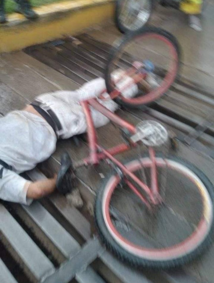 Según testigos, la llanta delantera de la bicicleta quedó atascada en una abertura que tiene la rejilla.