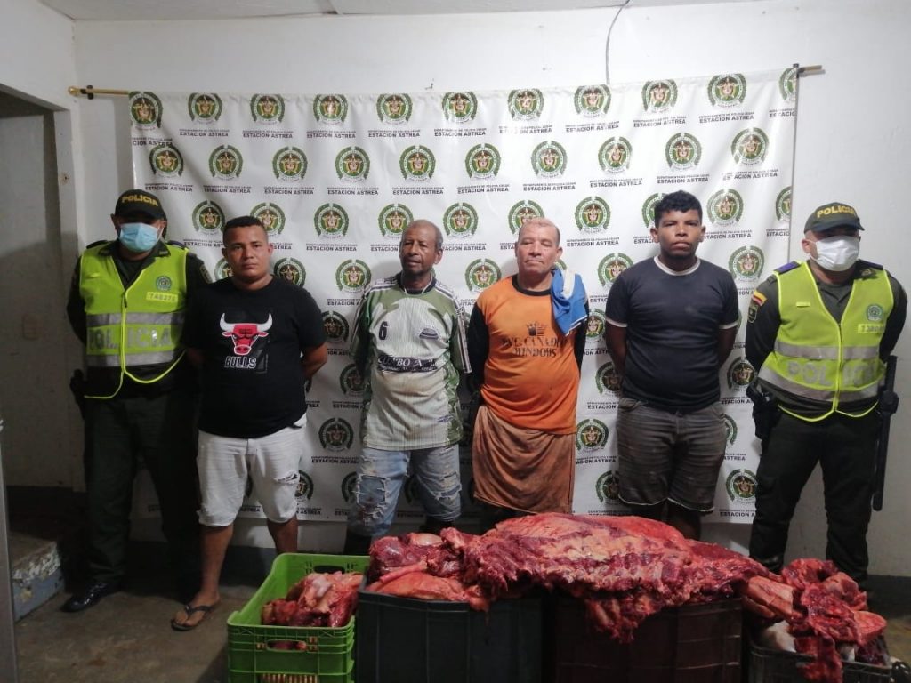 En un operativo contra el robo de ganado en Astrea, Cesar, la Policía capturó a cuatro sujetos que se movilizaban en un motocarro con dos canastas llenas de carne y un plástico negro con los restos de una vaca que al parecer habían hurtado de una finca en esa jurisdicción.