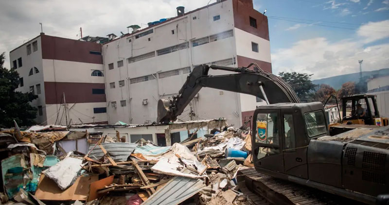 Con dos máquinas de construcción detrás, que destruían unas pequeñas edificaciones, el ministro hizo su declaración y adelantó que no aceptaría preguntas. Ni él ni ninguna otra autoridad dentro del penal aclara nada, mientras se mantiene un movimiento constante de vehículos de seguridad, maquinaria y autobuses.