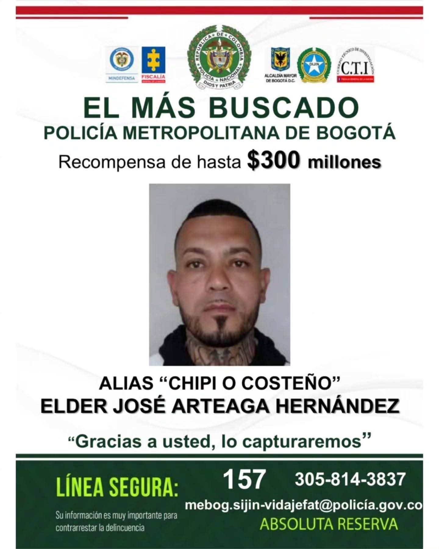 La Policía Nacional ha lanzado un cartel de búsqueda y ofrece una recompensa de hasta 300 millones de pesos por información que conduzca a la captura de Elder José Artega Hernández, conocido como alias “Chipi” o “el Costeño”. Se le señala como el principal planificador y dinamizador del ataque contra el senador Miguel Uribe Turbay, ocurrido en el parque El Golfito, en el barrio Modelia de Bogotá.